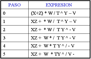 b)Expresión INFIJA:( X+Z )*W / T ^ Y - V